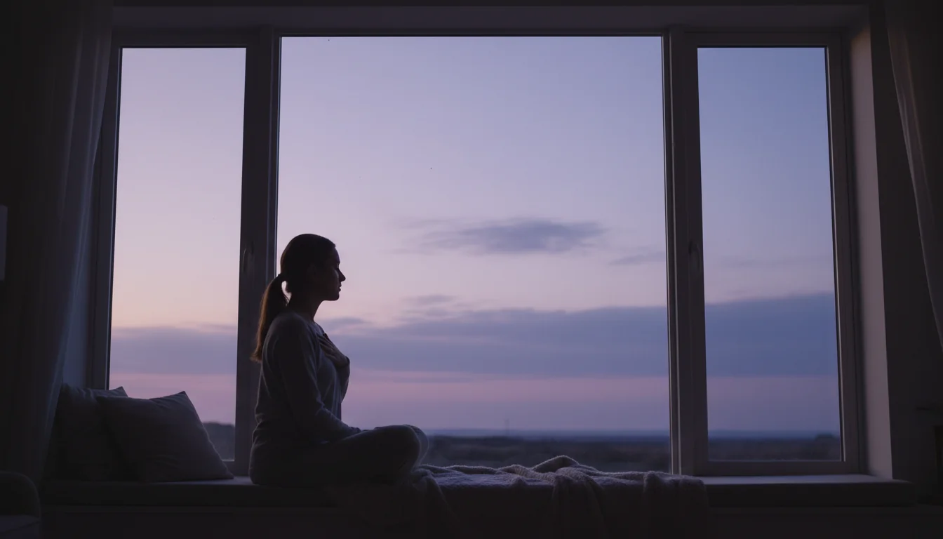 !Calm moment by a window — breathing, downshifting the nervous system after stress.